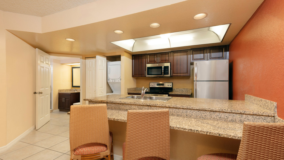 The exquisitely decorated One-Bedroom Villa offers spacious accommodations along with a variety of in-room amenities, including a king bed, queen sleeper sofa in the living area and fully equipped kitchen with a microwave and refrigerator, and complimentary use of shared laundry facility.