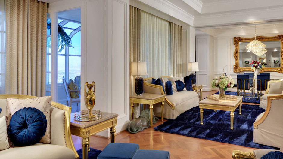 Breezy and colorful, the Bahamas Suite brings tropical energy to the desert. Relax among palm print patterns, laid-back furnishings, and vacation-ready vibes. You’ll feel like you’re on island time—with the Strip at your feet.