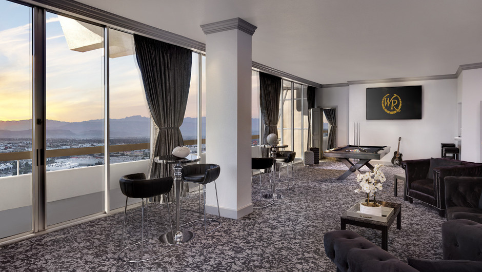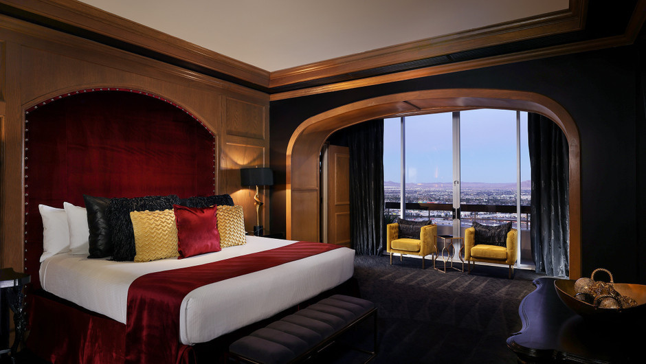 The Desert Suite is a sleek, 2,200-square-foot sanctuary perched above the Strip. With clean architectural lines and modern design, it features a king bed, two spa-inspired bathrooms, and panoramic skyline views. It's a serene yet striking Vegas retreat.