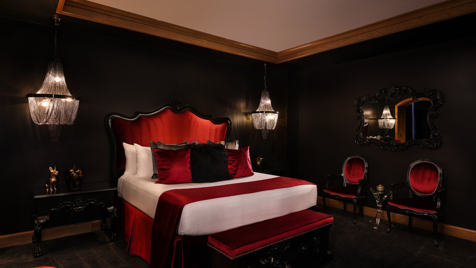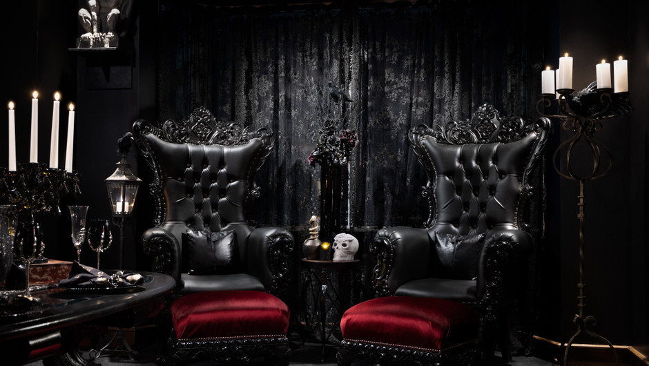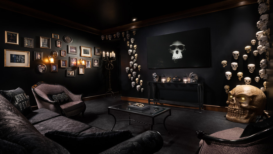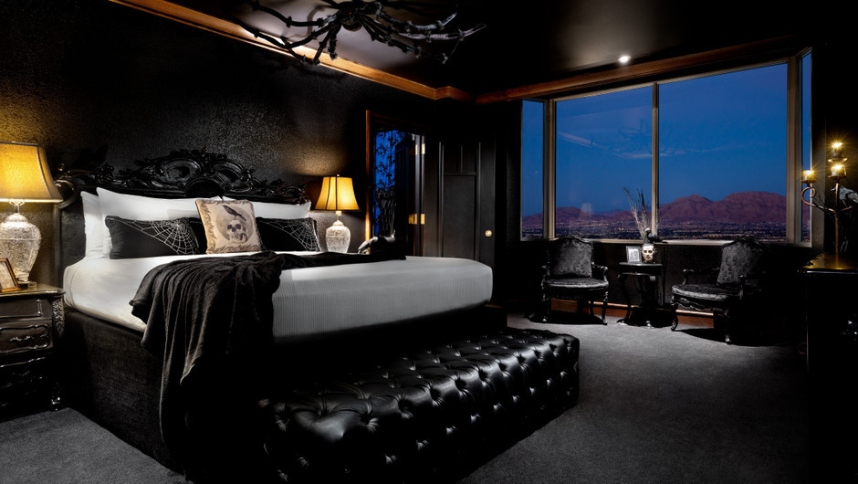 Welcome to 1,160 square feet of spooky sophistication! Step into a hauntingly stylish space featuring dark, dramatic walls, red velvet and black leather furnishings, eerie candelabras, and creepy-chic décor. With a separate living room and bedroom, two full bathrooms, and a wet bar, this suite delivers thrills and chills in luxury. Whether you’re a horror fan or just love a little mischief, every day is Halloween in this frightfully fabulous escape. The suite features a living room and separate bedroom with 2 full bathrooms, and a wet bar with mini refrigerator and coffee/tea maker.