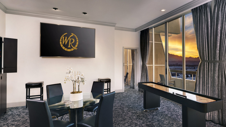 The glamorous 700 sq. ft. Family Suite at Westgate Las Vegas Resort & Casino provides a relaxing setting for your family to sit back and unwind after a busy day of roaming the city and splashing at the resort pool. Feel at home as you lounge in green bean bag chairs, swap stories of the Strip at the kitchen bar counter, and enjoy the suite’s table arcade and video game console.